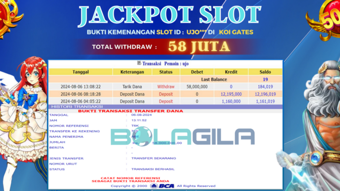 BOLAGILA mengucapkan selamat kepada user id : UJO*** yang telah berhasil mendapatkan jackpot pada permainan SLOT di KOI GATES. Kemenangan sebesar Rp 58.000.000,-. telah dibayarkan LUNAS oleh pihak bolagila kepada pemilik user id setelah yang bersangkutan mengisi formulir withdraw. Proses pencairan dana berlangsung sangat cepat hanya dalam waktu 6-11 menit sudah berada dalam rekening pemilik user id.
