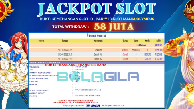 BOLAGILA mengucapkan selamat kepada user id : PAK*** yang telah berhasil mendapatkan jackpot pada permainan SLOT MANIA OLYMPUS. Kemenangan sebesar Rp 58.000.000,-. telah dibayarkan LUNAS oleh pihak bolagila kepada pemilik user id setelah yang bersangkutan mengisi formulir withdraw. Proses pencairan dana berlangsung sangat cepat hanya dalam waktu 6-11 menit sudah berada dalam rekening pemilik user id.