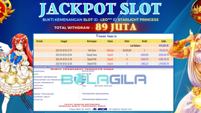 BOLAGILA mengucapkan selamat kepada user id : LEO*** yang telah berhasil mendapatkan jackpot pada permainan SLOT STARLIGHT PRINCESS. Kemenangan sebesar Rp 89.000.000,-. telah dibayarkan LUNAS oleh pihak bolagila kepada pemilik user id setelah yang bersangkutan mengisi formulir withdraw. Proses pencairan dana berlangsung sangat cepat hanya dalam waktu 6-11 menit sudah berada dalam rekening pemilik user id.