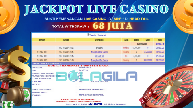 BOLAGILA JACKPOT LIVE CASINO HEAD TAIL Rp 68.000.000,- LUNAS