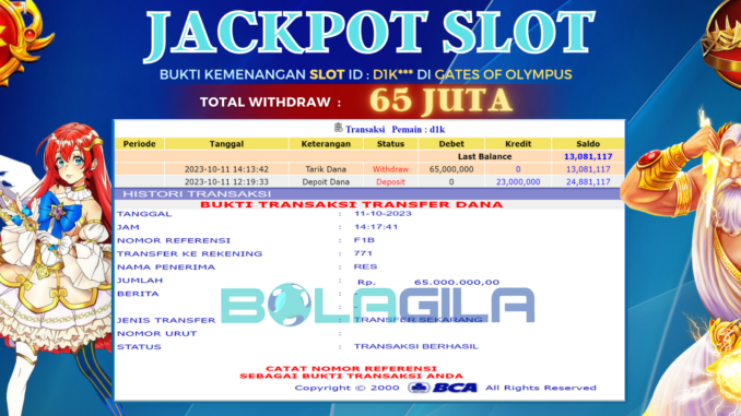 BOLAGILA mengucapkan selamat kepada user id : DIK*** yang telah berhasil mendapatkan jackpot pada permainan SLOT DI GATES OF OLYMPUS. Kemenangan sebesar Rp 65.000.000,-. telah dibayarkan LUNAS oleh pihak bolagila kepada pemilik user id setelah yang bersangkutan mengisi formulir withdraw. Proses pencairan dana berlangsung sangat cepat hanya dalam waktu 6-11 menit sudah berada dalam rekening pemilik user id.