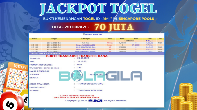 BOLAGILA mengucapkan selamat kepada user id : AMI*** yang telah berhasil mendapatkan jackpot TOGEL DI SINGAPORE POOLS . Kemenangan sebesar Rp 70.000.000,-. telah dibayarkan LUNAS oleh pihak bolagila kepada pemilik user id setelah yang bersangkutan mengisi formulir withdraw. Proses pencairan dana berlangsung sangat cepat hanya dalam waktu 6-11 menit sudah berada dalam rekening pemilik user id.
