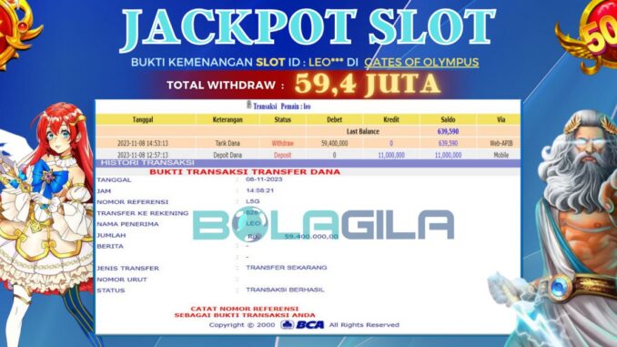 BOLAGILA mengucapkan selamat kepada user id : LEO*** yang telah berhasil mendapatkan jackpot SLOT DI GATES OF OLYMPUS . Kemenangan sebesar Rp 59.400.000,-. telah dibayarkan LUNAS oleh pihak bolagila kepada pemilik user id setelah yang bersangkutan mengisi formulir withdraw. Proses pencairan dana berlangsung sangat cepat hanya dalam waktu 6-11 menit sudah berada dalam rekening pemilik user id.