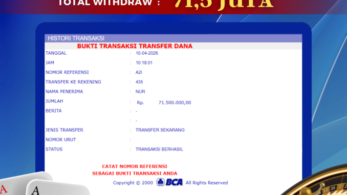 Bukti transfer yang dapat anda lihat adalah bukti SAH / VALID yang langsung di dapatkan melalui bukti transaksi dari Bank yang digunakan untuk pengiriman dana pada rekening pemilik user id. Terima kasih kami sampaikan kepada para pengguna setia BOLAGILA yang telah menggunakan situs kami, sebagai Bandar Terpercaya yang pastinya membayar semua kemenangan member hingga lunas. Apakah BOLAGILA PENIPU ? Reputasi “BOLAGILA TERPERCAYA” sudah sangat melekat.