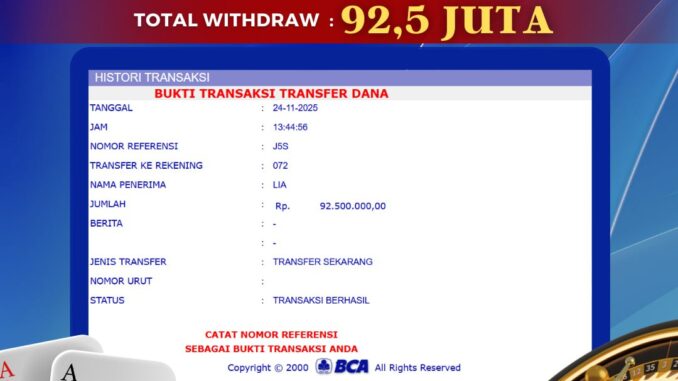 Bukti transfer yang dapat anda lihat adalah bukti SAH / VALID yang langsung di dapatkan melalui bukti transaksi dari Bank yang digunakan untuk pengiriman dana pada rekening pemilik user id. Terima kasih kami sampaikan kepada para pengguna setia BOLAGILA yang telah menggunakan situs kami, sebagai Bandar Terpercaya yang pastinya membayar semua kemenangan member hingga lunas. Apakah BOLAGILA PENIPU ? Reputasi “BOLAGILA TERPERCAYA” sudah sangat melekat.