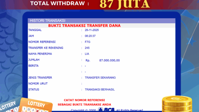 Bukti transfer yang dapat anda lihat adalah bukti SAH / VALID yang langsung di dapatkan melalui bukti transaksi dari Bank yang digunakan untuk pengiriman dana pada rekening pemilik user id. Terima kasih kami sampaikan kepada para pengguna setia BOLAGILA yang telah menggunakan situs kami, sebagai Bandar Terpercaya yang pastinya membayar semua kemenangan member hingga lunas. Apakah BOLAGILA PENIPU ? Reputasi “BOLAGILA TERPERCAYA” sudah sangat melekat.
