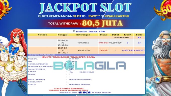 BOLAGILA JACKPOT SLOT DI KISAH KARTINI Rp 80.500.000,- LUNAS