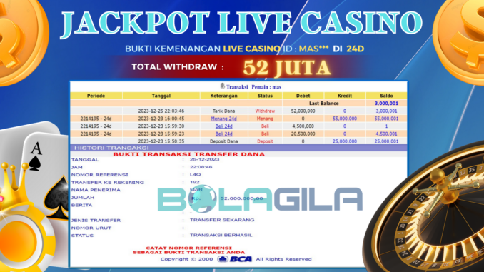 BOLAGILA JACKPOT LIVE CASINO DI 24D Rp 52.000.000,- LUNAS