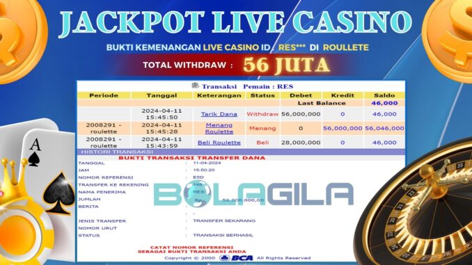 BOLAGILA JACKPOT LIVE CASINO DI ROULETTE Rp 56.000.000,- LUNAS