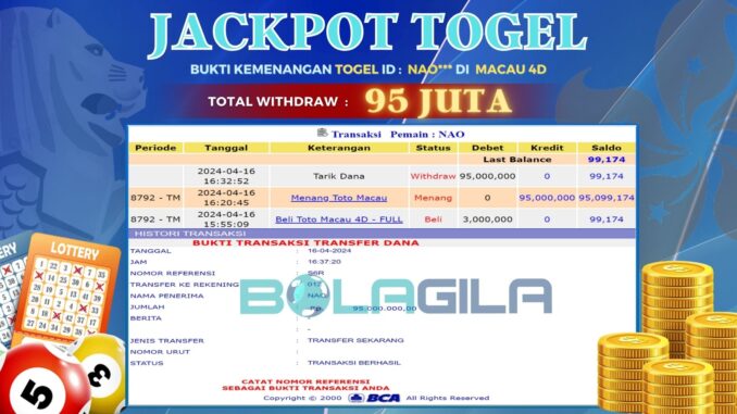 BOLAGILA JACKPOT TOGEL DI MACAU 4D Rp 95.000.000,- LUNAS