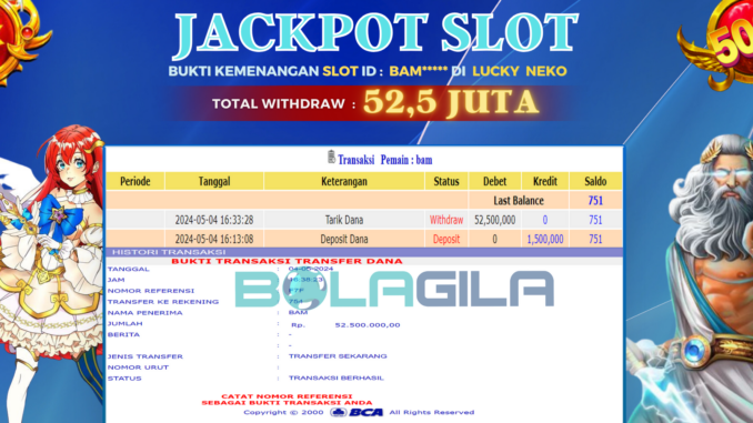 BOLAGILA mengucapkan selamat kepada user id : BAM*** yang telah berhasil mendapatkan jackpot SLOT DI LUCKY NEKO. Kemenangan sebesar Rp 52.500.000,-. telah dibayarkan LUNAS oleh pihak bolagila kepada pemilik user id setelah yang bersangkutan mengisi formulir withdraw. Proses pencairan dana berlangsung sangat cepat hanya dalam waktu 6-11 menit Sudah berada dalam rekening pemilik user id.