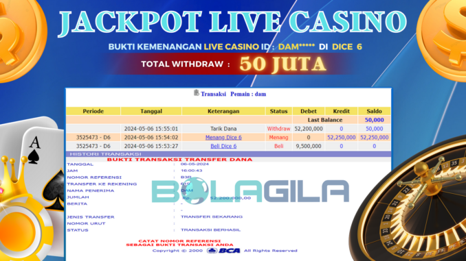BOLAGILA JACKPOT LIVE CASINO DI DICE 6 Rp 50.000.000,- LUNAS