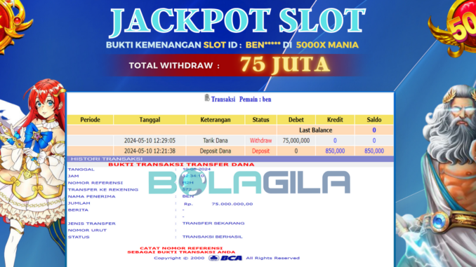 BOLAGILA mengucapkan selamat kepada user id : MON*** yang telah berhasil mendapatkan jackpot LIVE CASINO DI 24D. Kemenangan sebesar Rp 50.000.000,-. telah dibayarkan LUNAS oleh pihak bolagila kepada pemilik user id setelah yang bersangkutan mengisi formulir withdraw. Proses pencairan dana berlangsung sangat cepat hanya dalam waktu 6-11 menit Sudah berada dalam rekening pemilik user id.