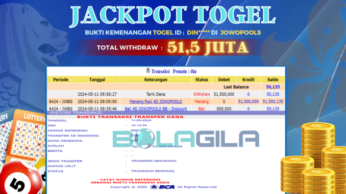 MEMBER BOLAGILA MENERIMA PELUNASAN KEMENANGAN JACKPOT TOGEL DI JOWOPOOLS Rp 51.500.000,- LUNAS