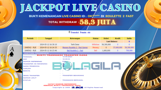 BOLAGILA mengucapkan selamat kepada user id : OKT*** yang telah berhasil mendapatkan jackpot LIVE CASINO DI ROULETTE 2 FAST. Kemenangan sebesar Rp 58.300.000,-. telah dibayarkan LUNAS oleh pihak bolagila kepada pemilik user id setelah yang bersangkutan mengisi formulir withdraw. Proses pencairan dana berlangsung sangat cepat hanya dalam waktu 6-11 menit Sudah berada dalam rekening pemilik user id.