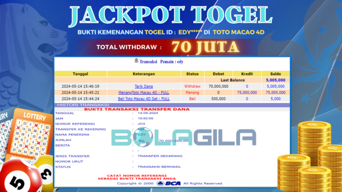 BOLAGILA mengucapkan selamat kepada user id : EDY*** yang telah berhasil mendapatkan jackpot TOGEL DI TOTO MACAU 4D . Kemenangan sebesar Rp 70.000.000,-. telah dibayarkan LUNAS oleh pihak bolagila kepada pemilik user id setelah yang bersangkutan mengisi formulir withdraw. Proses pencairan dana berlangsung sangat cepat hanya dalam waktu 6-11 menit Sudah berada dalam rekening pemilik user id.