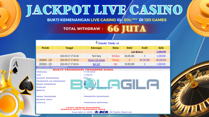 BOLAGILA JACKPOT LIVE CASINO DI 12D GAMES Rp 66.000.000,- LUNAS