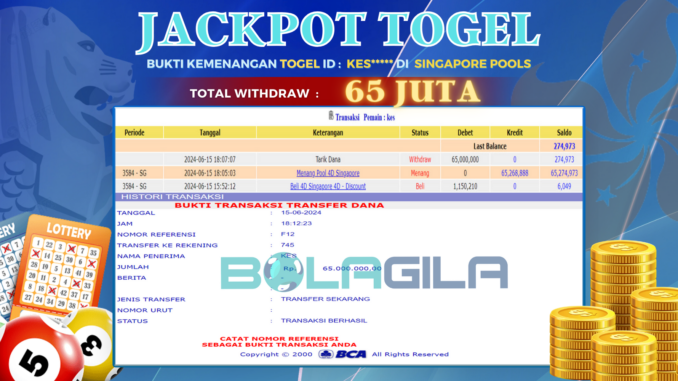 BOLAGILA JACKPOT TOGEL DI SINGAPORE POOLS Rp 65.000.000,- LUNAS