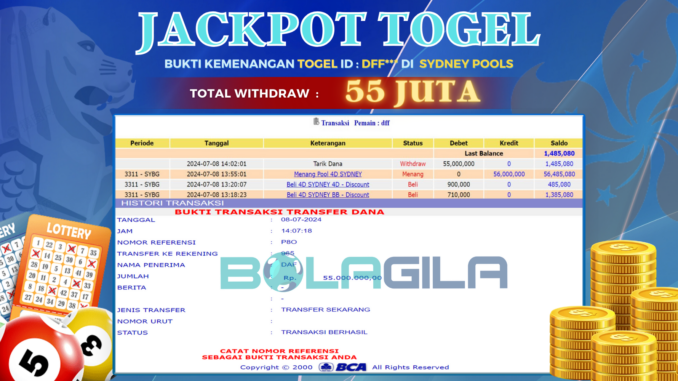 MEMBER BOLAGILA MENERIMA PELUNASAN JACKPOT TOGEL di SYDNEY POOLS Rp 55.000.000,- LUNAS