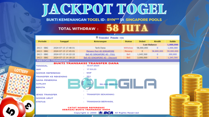 MEMBER BOLAGILA MENERIMA PELUNASAN KEMENANGAN TOGEL di SINGAPORE POOLS Rp 58.000.000,- LUNAS
