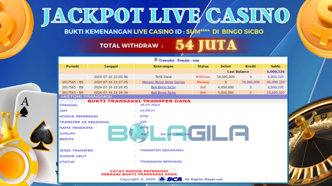 MEMBER BOLAGILA MENERIMA PELUNASAN JACKPOT LIVE CASINO DI BINGO SICBO Rp 54.000.000,- LUNAS