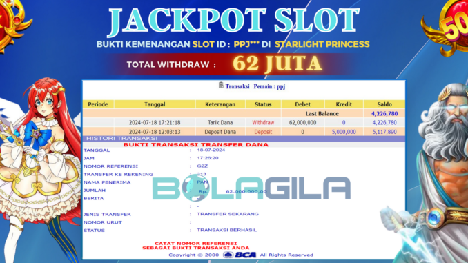 BOLAGILA mengucapkan selamat kepada user id : PPJ*** yang telah berhasil mendapatkan jackpot SLOT DI STARLIGHT PRINCESS. Kemenangan sebesar Rp 62.000.000,-. telah dibayarkan LUNAS oleh pihak bolagila kepada pemilik user id setelah yang bersangkutan mengisi formulir withdraw. Proses pencairan dana berlangsung sangat cepat hanya dalam waktu 6-11 menit Sudah berada dalam rekening pemilik user id.