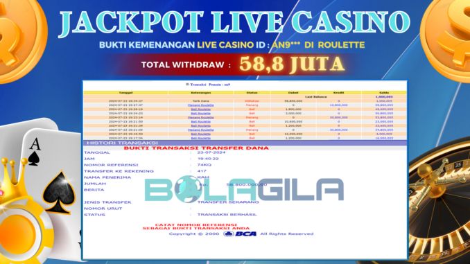 BOLAGILA JACKPOT LIVE CASINO DI ROULETTE Rp 58.800.000,- LUNAS