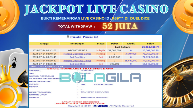 BOLAGILA mengucapkan selamat kepada user id : K69*** yang telah berhasil mendapatkan jackpot LIVE CASINO DI DUEL DICE 4D. Kemenangan sebesar Rp 52.000.000,-. telah dibayarkan LUNAS oleh pihak bolagila kepada pemilik user id setelah yang bersangkutan mengisi formulir withdraw. Proses pencairan dana berlangsung sangat cepat hanya dalam waktu 6-11 menit Sudah berada dalam rekening pemilik user id.