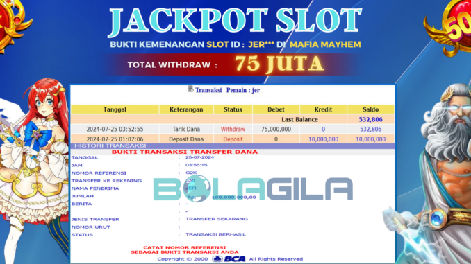 BOLAGILA mengucapkan selamat kepada user id : JER*** yang telah berhasil mendapatkan jackpot SLOT DI MAFIA MAYHEM. Kemenangan sebesar Rp 75.000.000,-. telah dibayarkan LUNAS oleh pihak bolagila kepada pemilik user id setelah yang bersangkutan mengisi formulir withdraw. Proses pencairan dana berlangsung sangat cepat hanya dalam waktu 6-11 menit Sudah berada dalam rekening pemilik user id.