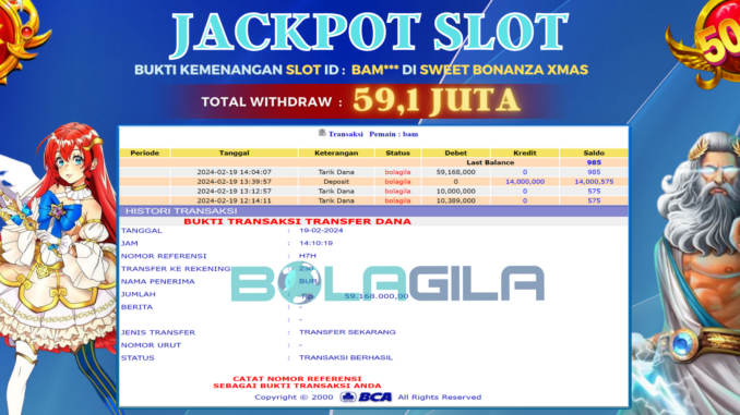 BOLAGILA mengucapkan selamat kepada user id : BAM*** yang telah berhasil mendapatkan jackpot SLOT DI SWEET BONANZA XMAS. Kemenangan sebesar Rp 59.100.000,-. telah dibayarkan LUNAS oleh pihak bolagila kepada pemilik user id setelah yang bersangkutan mengisi formulir withdraw. Proses pencairan dana berlangsung sangat cepat hanya dalam waktu 6-11 menit sudah berada dalam rekening pemilik user id.