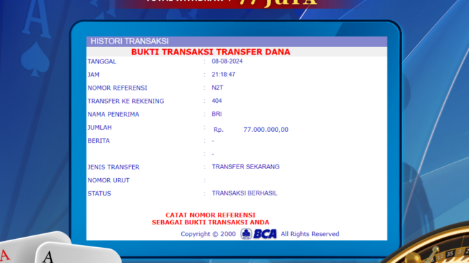 Bukti transfer yang dapat anda lihat adalah bukti SAH / VALID yang langsung di dapatkan melalui bukti transaksi dari Bank yang digunakan untuk pengiriman dana pada rekening pemilik user id. Terima kasih kami sampaikan kepada para pengguna setia BOLAGILA yang telah menggunakan situs kami, sebagai Bandar Terpercaya yang pastinya membayar semua kemenangan member hingga lunas. Apakah BOLAGILA PENIPU ? Reputasi “BOLAGILA TERPERCAYA” sudah sangat melekat.