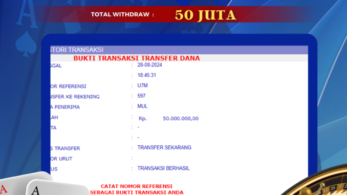 BOLAGILA mengucapkan selamat kepada user id : MUL*** yang telah berhasil mendapatkan jackpot LIVE CASINO DI 48D. Kemenangan sebesar Rp 50.000.000,-. telah dibayarkan LUNAS oleh pihak bolagila kepada pemilik user id setelah yang bersangkutan mengisi formulir withdraw. Proses pencairan dana berlangsung sangat cepat hanya dalam waktu 6-11 menit Sudah berada dalam rekening pemilik user id.