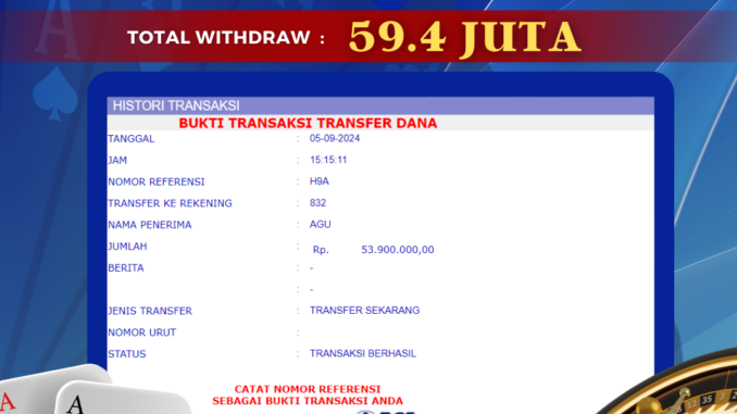 Bukti transfer yang dapat anda lihat adalah bukti SAH / VALID yang langsung di dapatkan melalui bukti transaksi dari Bank yang digunakan untuk pengiriman dana pada rekening pemilik user id. Terima kasih kami sampaikan kepada para pengguna setia BOLAGILA yang telah menggunakan situs kami, sebagai Bandar Terpercaya yang pastinya membayar semua kemenangan member hingga lunas. Apakah BOLAGILA PENIPU ? Reputasi “BOLAGILA TERPERCAYA” sudah sangat melekat.