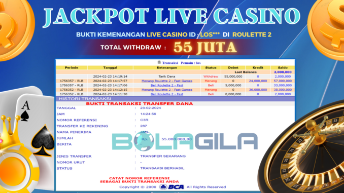 BOLAGILA JACKPOT LIVE CASINO DI ROULETTE 2 Rp 55.000.000,- LUNAS