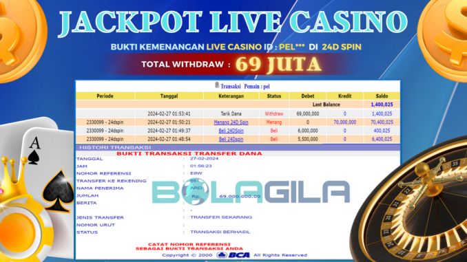 BOLAGILA JACKPOT LIVE CASINO DI 24D SPIN Rp 69.000.000,- LUNAS