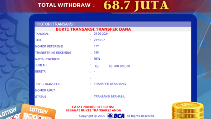 Bukti transfer yang dapat anda lihat adalah bukti SAH / VALID yang langsung di dapatkan melalui bukti transaksi dari Bank yang digunakan untuk pengiriman dana pada rekening pemilik user id. Terima kasih kami sampaikan kepada para pengguna setia BOLAGILA yang telah menggunakan situs kami, sebagai Bandar Terpercaya yang pastinya membayar semua kemenangan member hingga lunas. Apakah BOLAGILA PENIPU ? Reputasi “BOLAGILA TERPERCAYA” sudah sangat melekat.