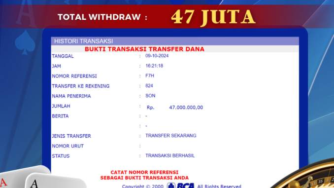 Bukti transfer yang dapat anda lihat adalah bukti SAH / VALID yang langsung di dapatkan melalui bukti transaksi dari Bank yang digunakan untuk pengiriman dana pada rekening pemilik user id. Terima kasih kami sampaikan kepada para pengguna setia BOLAGILA yang telah menggunakan situs kami, sebagai Bandar Terpercaya yang pastinya membayar semua kemenangan member hingga lunas. Apakah BOLAGILA PENIPU ? Reputasi “BOLAGILA TERPERCAYA” sudah sangat melekat.