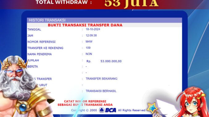 SLOT DI GATES OF OLYMPUS. Kemenangan sebesar Rp 53.000.000,-. telah dibayarkan LUNAS oleh pihak bolagila kepada pemilik user id setelah yang bersangkutan mengisi formulir withdraw. Proses pencairan dana berlangsung sangat cepat hanya dalam waktu 6-11 menit Sudah berada dalam rekening pemilik user id.