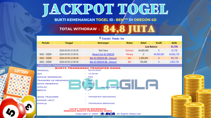 BOLAGILA JACKPOT TOGEL DI OREGON 4D Rp 84.800.000,- LUNAS