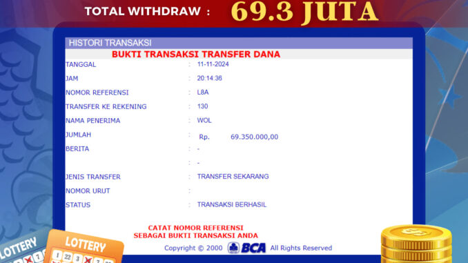 Bukti transfer yang dapat anda lihat adalah bukti SAH / VALID yang langsung di dapatkan melalui bukti transaksi dari Bank yang digunakan untuk pengiriman dana pada rekening pemilik user id. Terima kasih kami sampaikan kepada para pengguna setia BOLAGILA yang telah menggunakan situs kami, sebagai Bandar Terpercaya yang pastinya membayar semua kemenangan member hingga lunas. Apakah BOLAGILA PENIPU ? Reputasi “BOLAGILA TERPERCAYA” sudah sangat melekat.
