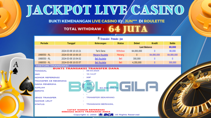 BOLAGILA JACKPOT LIVE CASINO DI ROULETTE Rp 64.000.000,- LUNAS