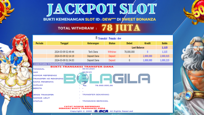 BOLAGILA mengucapkan selamat kepada user id : DEW*** yang telah berhasil mendapatkan jackpot SLOT DI SWEET BONANZA. Kemenangan sebesar Rp 78.000.000,-. telah dibayarkan LUNAS oleh pihak bolagila kepada pemilik user id setelah yang bersangkutan mengisi formulir withdraw. Proses pencairan dana berlangsung sangat cepat hanya dalam waktu 6-11 menit sudah berada dalam rekening pemilik user id.