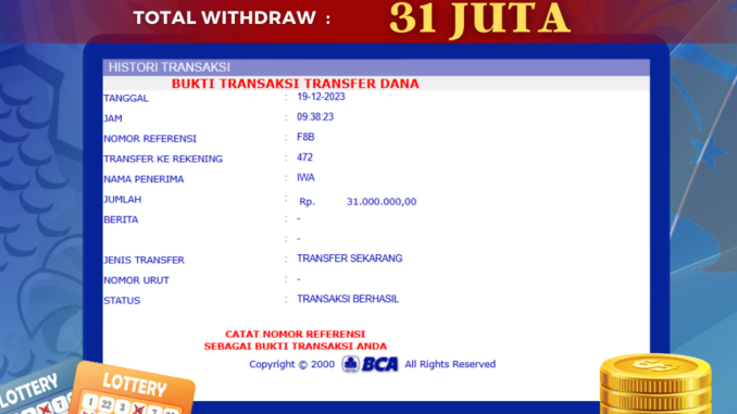 Bukti transfer yang dapat anda lihat adalah bukti SAH / VALID yang langsung di dapatkan melalui bukti transaksi dari Bank yang digunakan untuk pengiriman dana pada rekening pemilik user id. Terima kasih kami sampaikan kepada para pengguna setia BOLAGILA yang telah menggunakan situs kami, sebagai Bandar Terpercaya yang pastinya membayar semua kemenangan member hingga lunas. Apakah BOLAGILA PENIPU ? Reputasi “BOLAGILA TERPERCAYA” sudah sangat melekat.