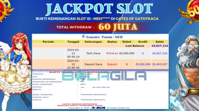 SLOT DI GATES OF GATOTKACA. Kemenangan sebesar Rp 60.000.000,-. telah dibayarkan LUNAS oleh pihak bolagila kepada pemilik user id setelah yang bersangkutan mengisi formulir withdraw. Proses pencairan dana berlangsung sangat cepat hanya dalam waktu 6-11 menit s