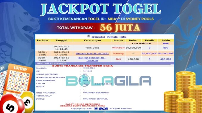 MEMBER BOLAGILA MENERIMA PELUNASAN KEMENANGAN JACKPOT TOGEL DI SYDNEY POOLS Rp 56.000.000,- LUNAS