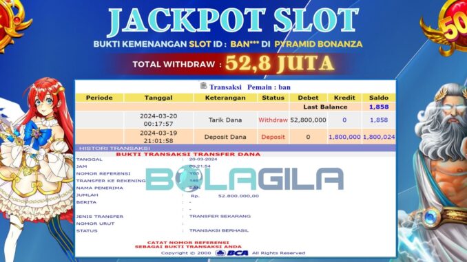 BOLAGILA mengucapkan selamat kepada user id : BAN*** yang telah berhasil mendapatkan jackpot SLOT DI PYRAMID BONANZA. Kemenangan sebesar Rp 52.800.000,-. telah dibayarkan LUNAS oleh pihak bolagila kepada pemilik user id setelah yang bersangkutan mengisi formulir withdraw. Proses pencairan dana berlangsung sangat cepat hanya dalam waktu 6-11 menit Sudah berada dalam rekening pemilik user id.