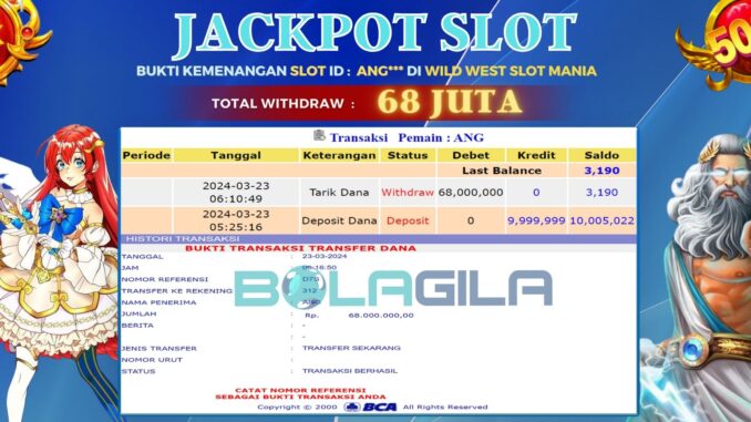 BOLAGILA mengucapkan selamat kepada user id : ANG*** yang telah berhasil mendapatkan jackpot SLOT DI WILD WEST SLOT MANIA. Kemenangan sebesar Rp 68.000.000,-. telah dibayarkan LUNAS oleh pihak bolagila kepada pemilik user id setelah yang bersangkutan mengisi formulir withdraw. Proses pencairan dana berlangsung sangat cepat hanya dalam waktu 6-11 menit Sudah berada dalam rekening pemilik user id.