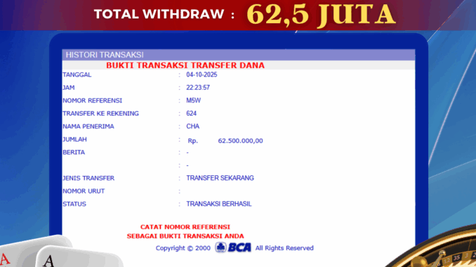 MEMBER BOLAGILA MENERIMA PELUNASAN KEMENANGAN JACKPOT LIVE CASINO DI HEAD TAIL Rp 62.500.000,- LUNAS