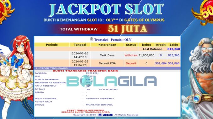 BOLAGILA mengucapkan selamat kepada user id : OLY*** yang telah berhasil mendapatkan jackpot SLOT DI GATES OF OLYMPUS . Kemenangan sebesar Rp 51.000.000,-. telah dibayarkan LUNAS oleh pihak bolagila kepada pemilik user id setelah yang bersangkutan mengisi formulir withdraw. Proses pencairan dana berlangsung sangat cepat hanya dalam waktu 6-11 menit Sudah berada dalam rekening pemilik user id.