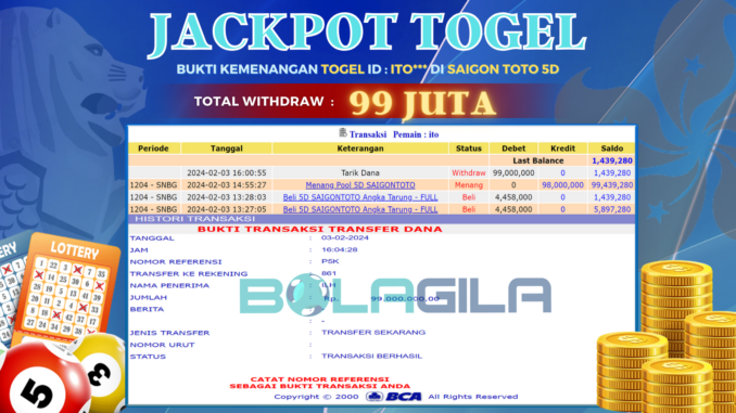 MEMBER BOLAGILA MENERIMA PELUNASAN KEMENANGAN BOLAGILA JACKPOT TOGEL DI SAIGON TOTO 5D Rp 99.000.000,- LUNAS